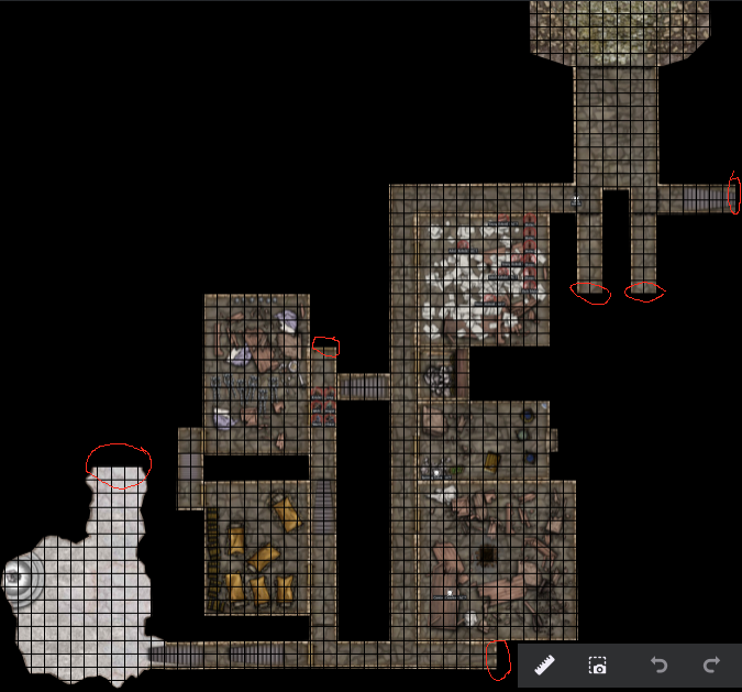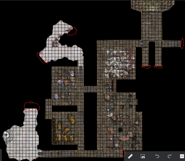 Next Step: @Jetpacks22 (John), any further introduction or statements you want to give here to help convince the party to allow you to join? Also, for everyone, describe how you will proceed and then roll .turn dice. …and here is another overall view of the dungeon that you have explored so far - I added red circles everywhere where you have a door, archway, or passageway that you have not finished exploring.