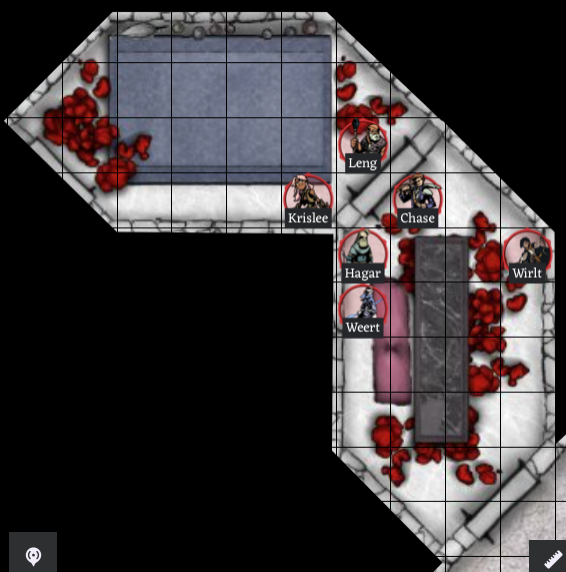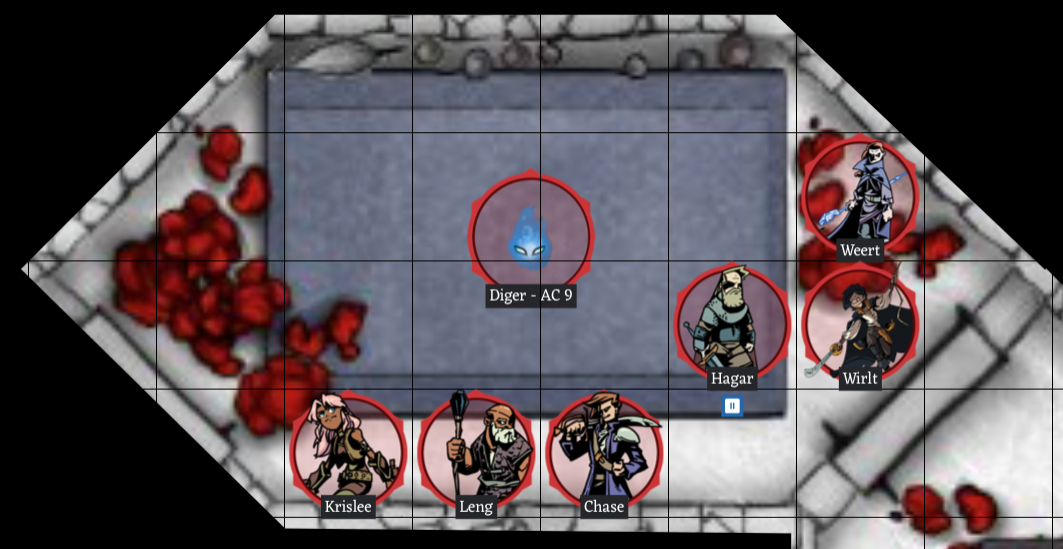 The rest of the party shuffles into the room. Krislee, Leng, and Chase head for the west side of the pool, and Hagar, Wirlt and Weert stay on the east side. As Hagar kneels down by the pool, preparing to scoop up a handful of water, he sees two gems in the middle of the pool. Distracted, he puts his hand into the water, and at the same time, the gems “blink”, like eyes. He feels his hand going numb, and the paralysis quickly travels up his arm and through the rest of his body. He falls into the “pool”, paralyzed. (You failed your Paralysis saving throw!) His body stops falling in after only about 2 feet, it looks like he is resting on something transparent at the bottom of the pool. Wirlt recognizes the monster (19 Activity Roll), and shouts, “It must be a Diger!. It will paralyze if you touch its secretions, we need to kill it without touching the “water” above it if we’re going to save Hagar!.” As if to emphasize Wirlt’s point, you can see Hagar’s chain mail start to release bubbles up through the “water” where he landed on his back on top of the Diger. Next Step: Describe how you will attack the Diger in the next 2 rounds, roll .combat, and then your .weapon roll (Ex: .crossbow, .shortbow, .sword, etc.) Hagar is paralyzed, and cannot make any moves or participate in combat. (edited)