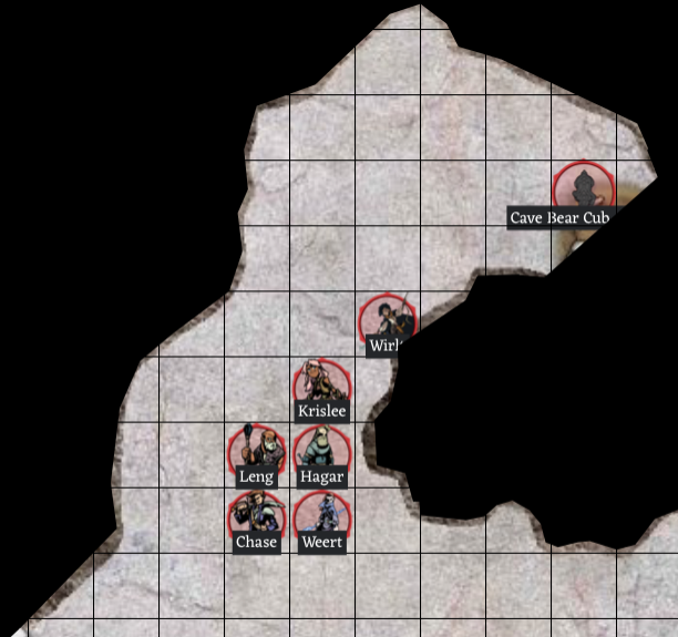 Wirlt attempts to move silently around the corner, but fails to do so (needed to roll a 1-10 for Activity, she rolled a 13), making scuffling noises on the loose rock on the floor. In doing so, she wakes the sleeping beast. She does look carefully at it, then turns around to Krislee and the group and says, “It’s a cave bear cub, but it’s chained to the wall.” Also of note, there are two animal chains, but only one is used right now, chained to the cave bear cub. The other appears to have been broken. There is some straw on the floor of the cave, where the cub had been sleeping. The cave continues around the corner to the east, beyond where Wirlt can see. The cave bear cub begins growling and then roaring, making a lot of noise that echoes off of the cavern walls, traveling who knows how far. Next Step: Describe how you will proceed and then roll .turn dice. If you wish to attack, then describe your attempted combat actions, roll .combat and .{weapon}.