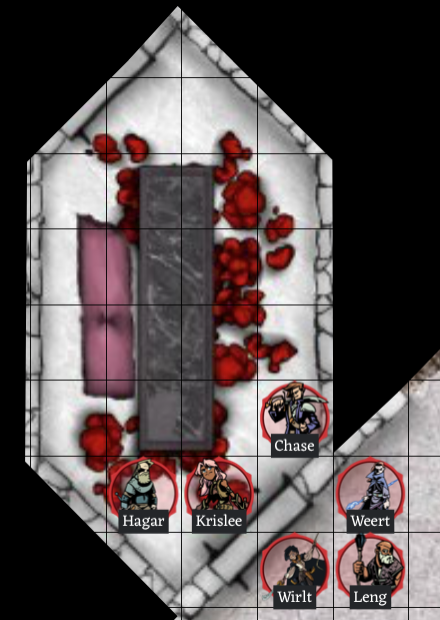 You search the whole room. There are no intact weapons left in the room, and all the bodies have apparently been searched thoroughly, leaving nothing of value on them. Upon closer examination, you notice the same wolf’s head insignia that you found on the broken sword (from the Carrion Crawler) is on the uniforms of the soldiers. You do see plenty of Carrion Crawler slime in the room, so perhaps it killed these soldiers. Beheading, arranging bodies, and stripping them of valuables does not sound like behavior of a carrion eater though. Something or someone else evil must have done this. Krislee is right, this is horrific. I won’t give further explanations about the heads or bodies. As before, none of you recognize or recall seeing the insignia before entering this dungeon. Next Step: I’m simplifying your choices again. Move through the east door or go back the way you came?
