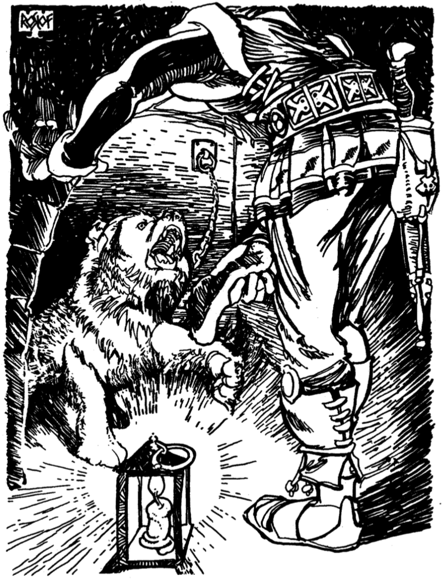 Hagar approaches the bear cub, and fumbles with the latch on the chained cuff on the bears' back leg while keeping the shield up between them. The bear cub is wary at first, then turns aggressive quickly. It swipes at Hagar with its front paw, hitting the shield and doing no harm to him. It growls and then full on roars at him, pushing him back before he can unlatch it. (Due to its aggressive reaction, you will receive a -4 to the next reaction roll.) Next Step: Describe how you will proceed and then roll .turn dice.
