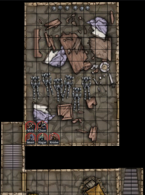 Krislee peeks through the northwest door, and sees a stairway leading down to another door. The rest of the party follows her down the stairs. Opening the next door and entering the room, you see a grisly sight. The room contains the remains of bunks, bedrolls, oaken tables, stools, benches, and 6 dead soldiers which have been beheaded. Along the north wall is a line of 6 heads. There is another door on the east wall. Next Step: Describe how you will proceed and then roll .turn dice.