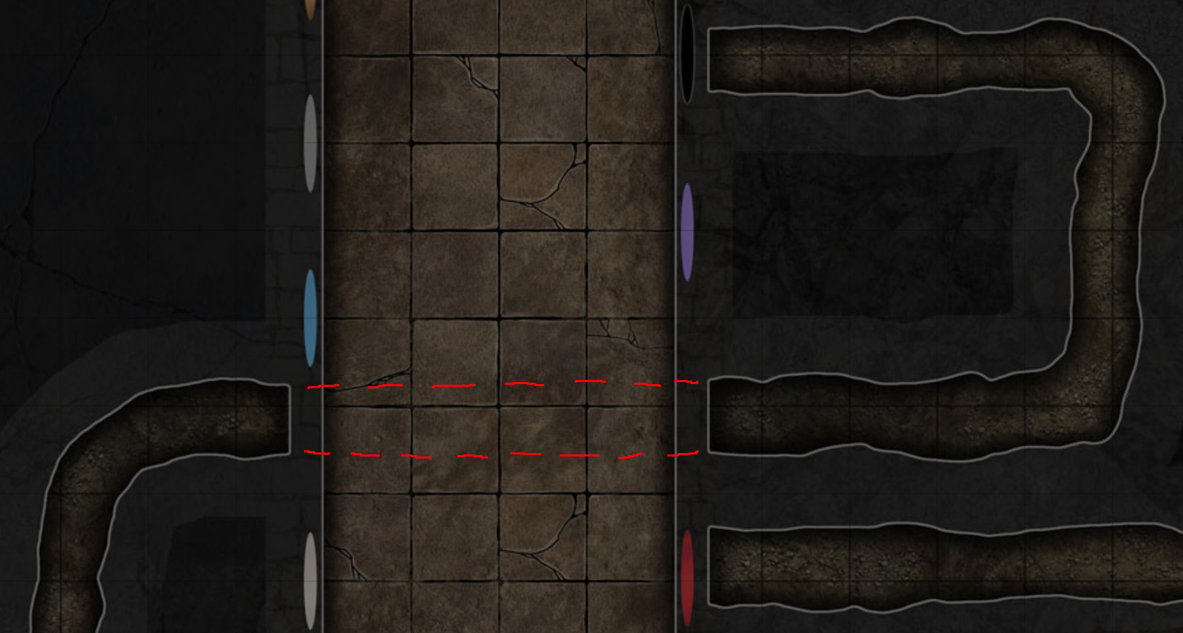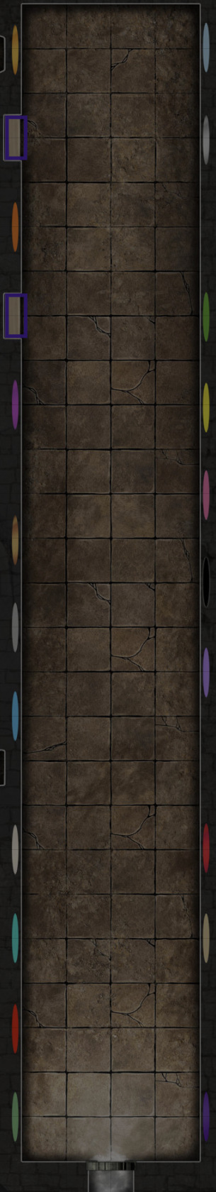 The party continued down the hallway, tapping each painted sphere to determine if there was anything trapped or out of the ordinary. They decided to ignore the arch for now. They determined that only the "BLACK at feet" and "RED held waist high" spheres on the east wall were illusionary, both having tunnels behind them. They decided to go through the BLACK sphere first, moving in single file since the tunnel was so narrow. The tunnel sloped downward, then reversed direction to go back under the hallway.