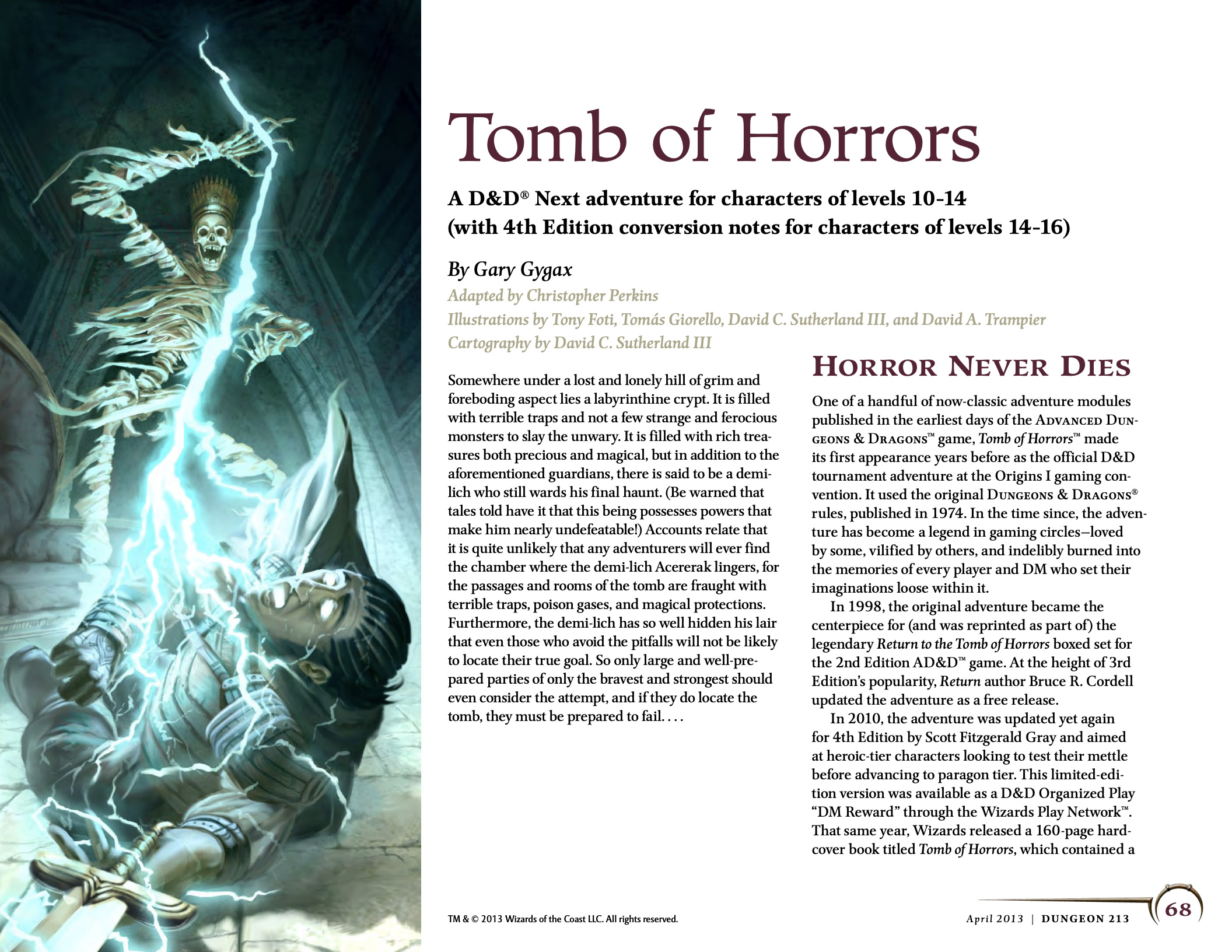 We started with a bit of history (from Wikipedia): "Tomb of Horrors is an adventure module written by Gary Gygax for the Dungeons & Dragons (D&D) role-playing game. It was originally written for and used at the 1975 Origins 1 convention. Gygax designed the adventure both to challenge the skill of expert players in his own campaign and to test players who boasted of having mighty player characters able to best any challenge. The module's plot revolves around the tomb of the demilich Acererak. The player characters must battle their way past a variety of monsters and traps, with the ultimate goal of destroying Acererak. Tomb of Horrors was considered the third greatest Dungeons & Dragons adventure of all time by the staff of Dungeon in 2004."